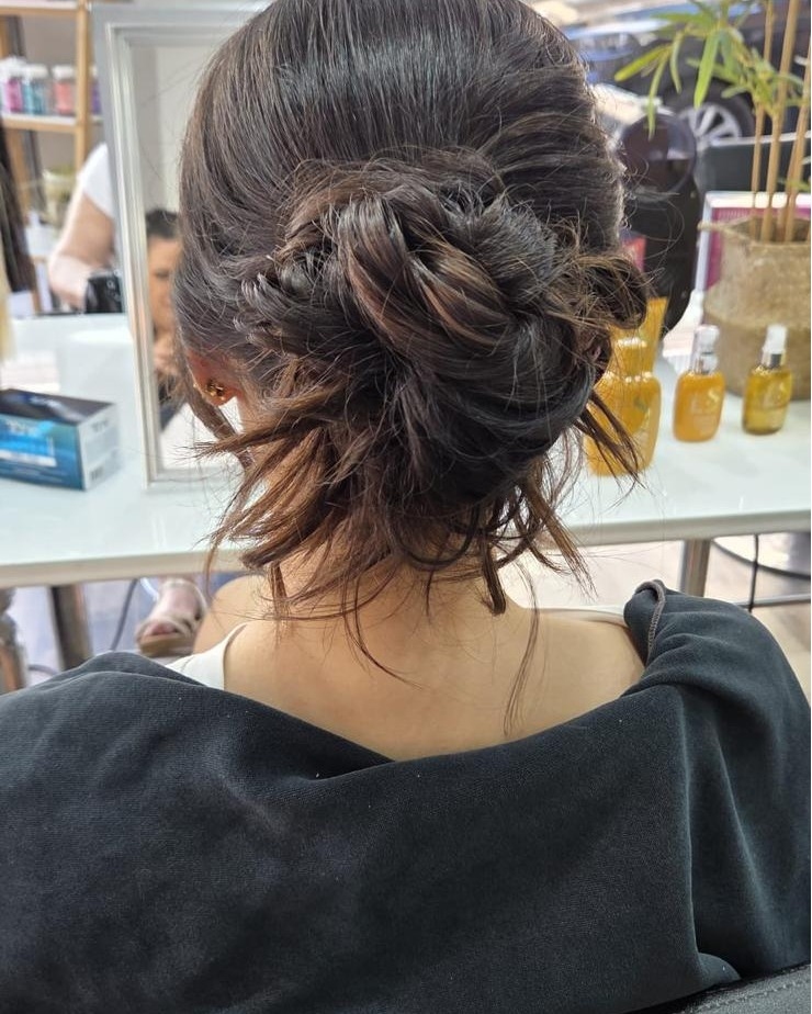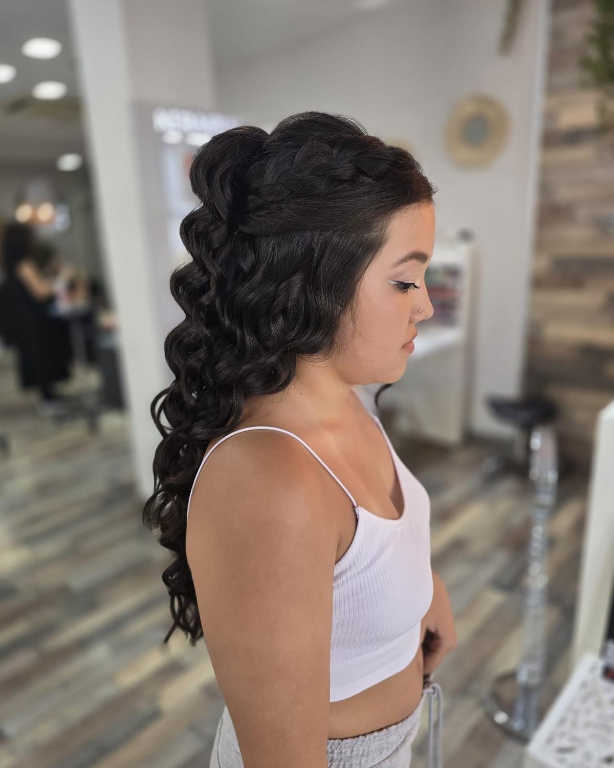 Si tu estilo es más relajado y natural, una trenza deshecha o una corona de trenzas es la opción ganadora. Aportan un aire soñador y juvenil que combina de maravilla con vestidos vaporosos. En nuestros salones podemos añadir accesorios como lazos de terciopelo rojo para elevar el look al siguiente nivel.
