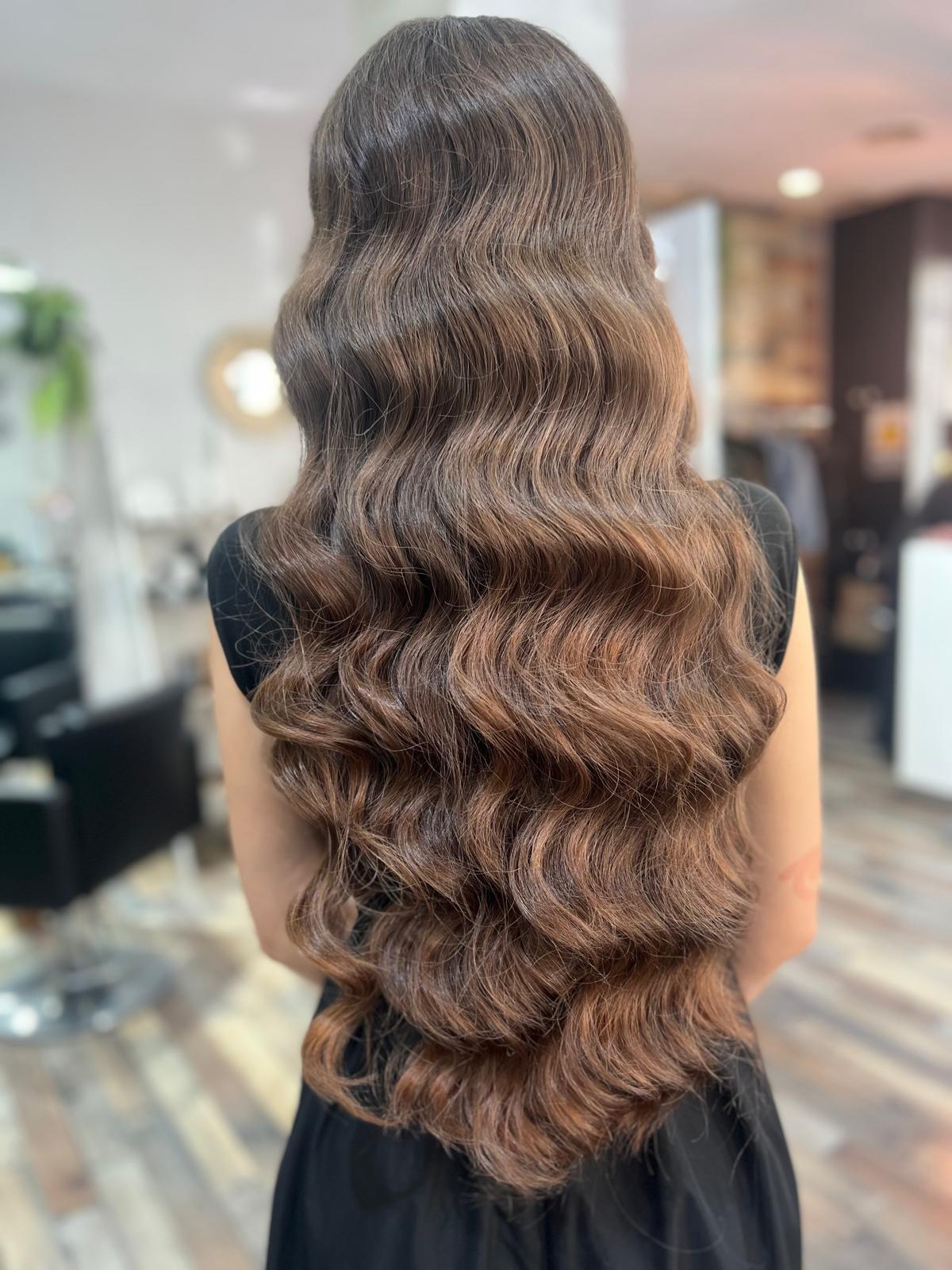 Si buscas un look sofisticado y glamuroso, las ondas al agua son tu mejor aliado. Este estilo aporta volumen, brillo y un aire de estrella de cine que nunca falla. Es ideal para melenas midi o largas que quieran destacar con un toque clásico.